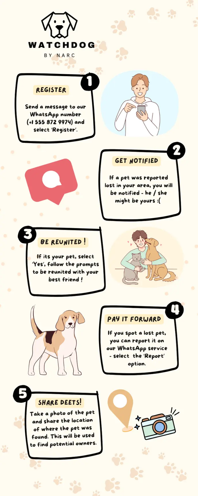 Watchdog is a public service offering that allows good Samaritans to report pets found walking about a neighbourhood in an effort to reunite them with their owners.